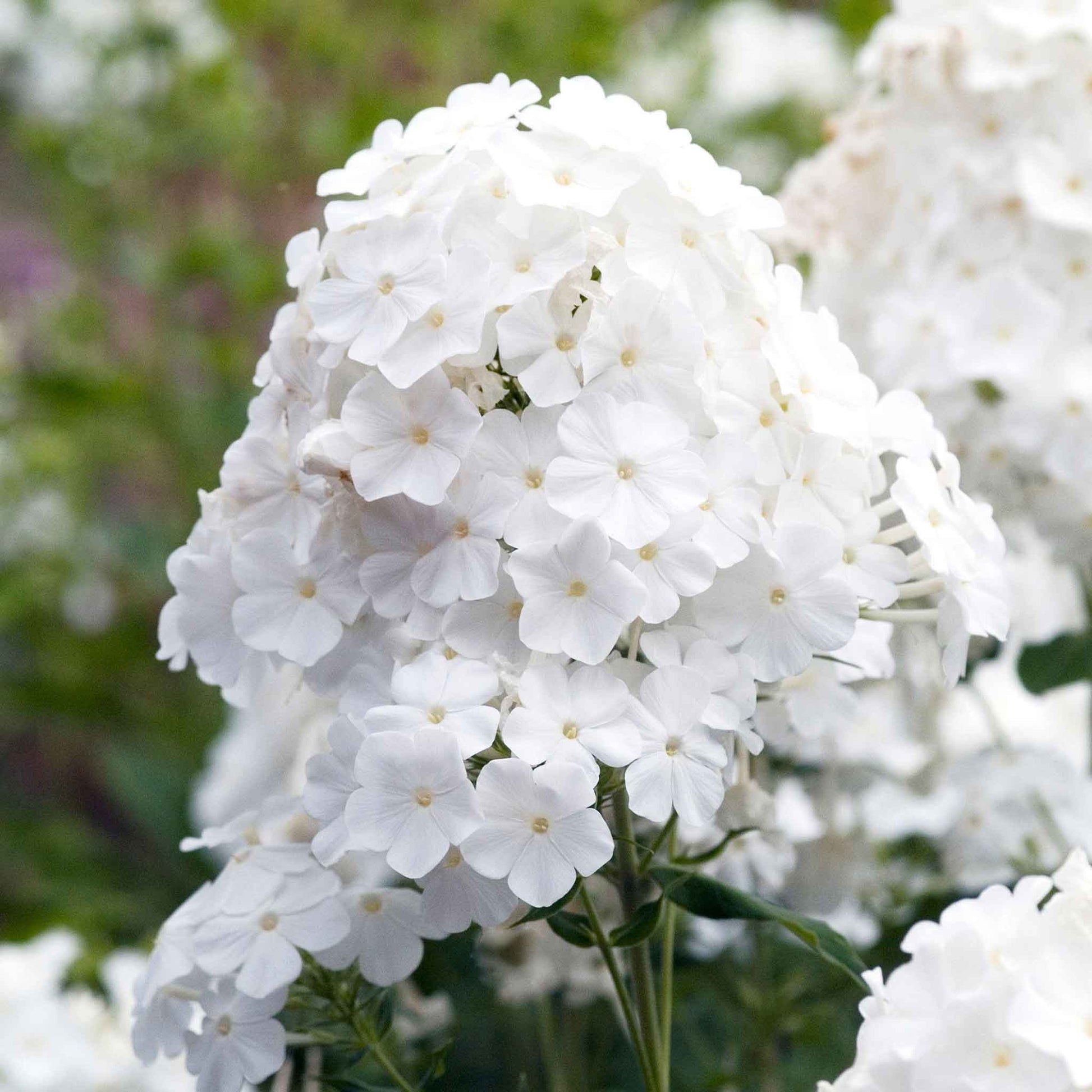 Phlox Roots David showcases stunning white blooming phlox atop contrasting deep green foliage. One of our biggest phloxes we offer with huge flowerheads and disease resistance. This phlox is a robust bloomer from mid-summer to early autumn. Plant in full sun, with well-draining soil and adequate air flow for best results.